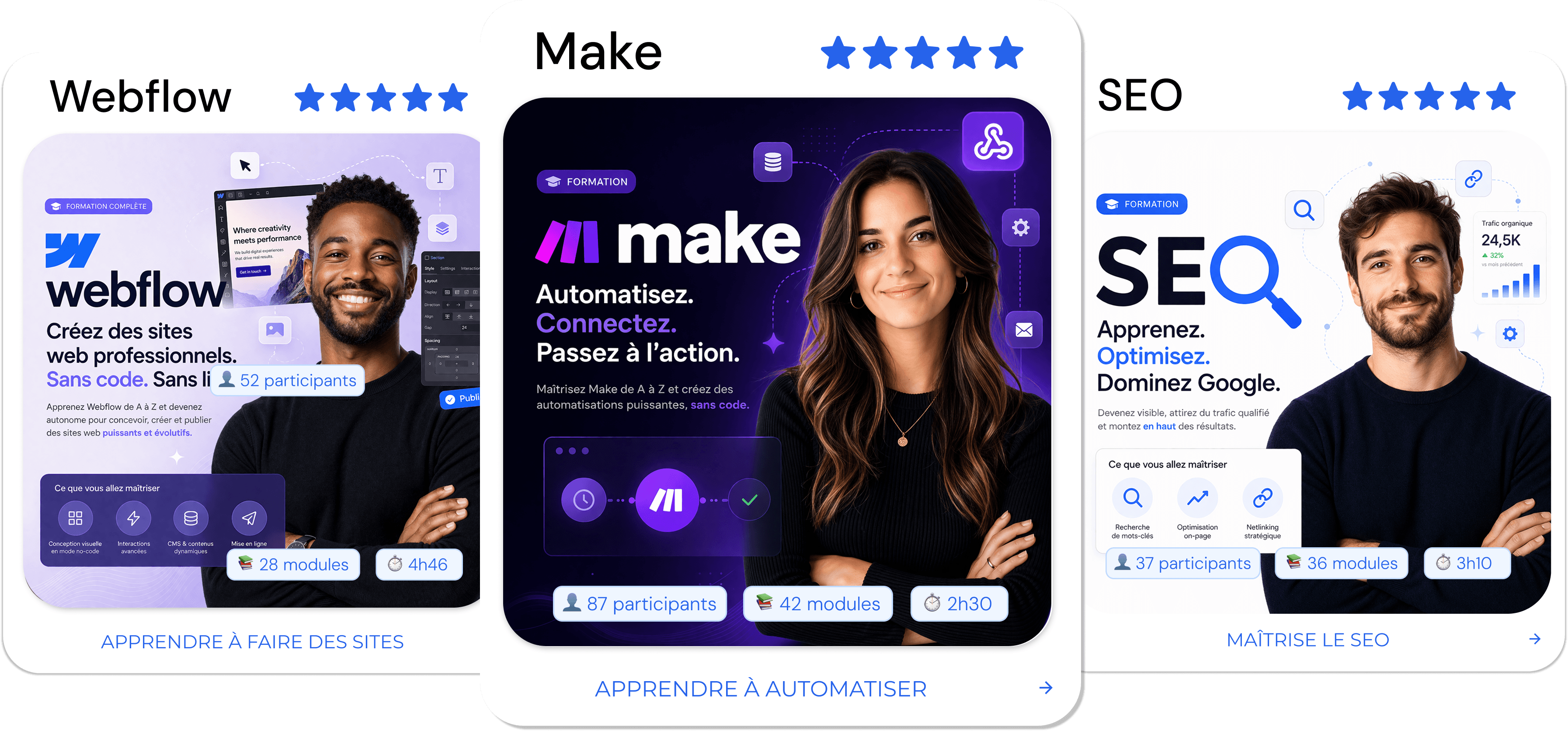 - 🎓 Des formations pour apprendre vite et bien (SEO, automation, pub en ligne, création de contenu, etc.)